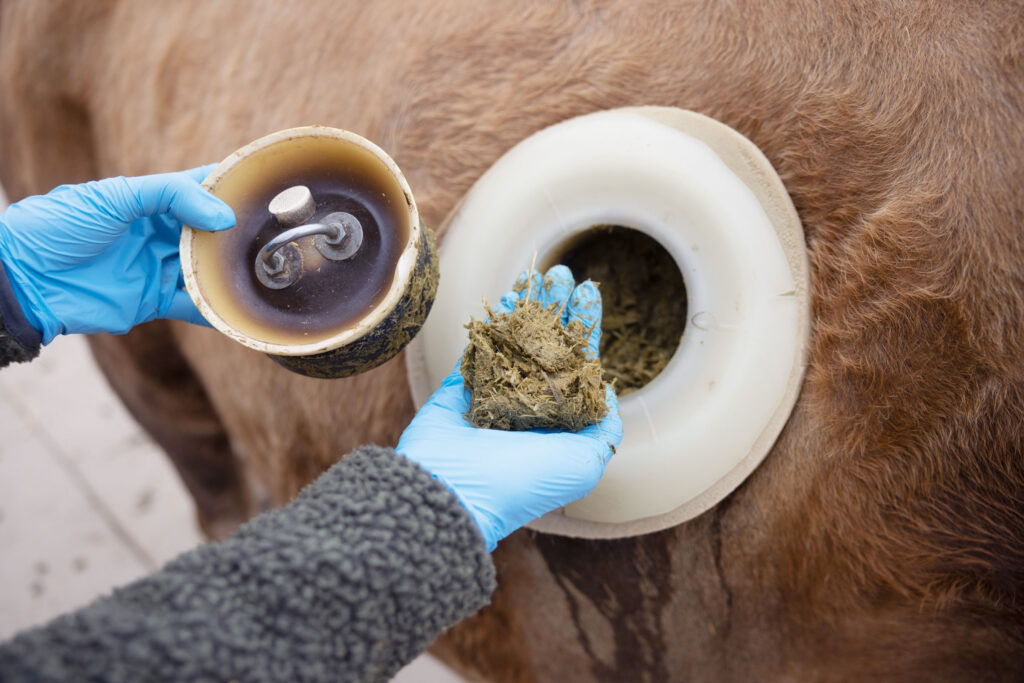 Durch die sogenannte Pansenfistel kann man Proben aus dem Vormagen eines Rindes entnehmen, in dem das Gras von Mikroorganismen verdaut wird.